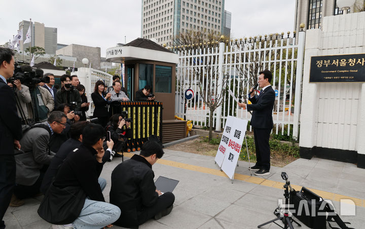 政府ソウル庁舎前で記者会見する金民錫・共に民主党最高委員(7/9)