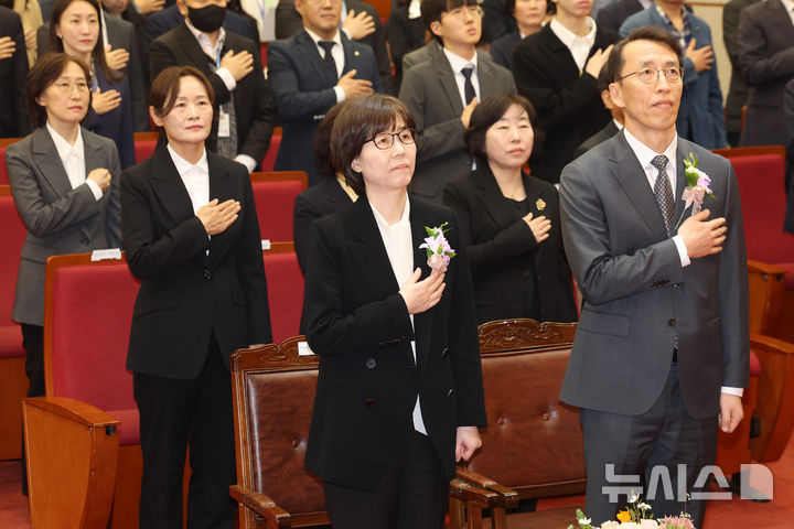退任のお祝いを受ける文炯培・憲法裁所長権限代行と李美善・憲法裁判官(2/15)