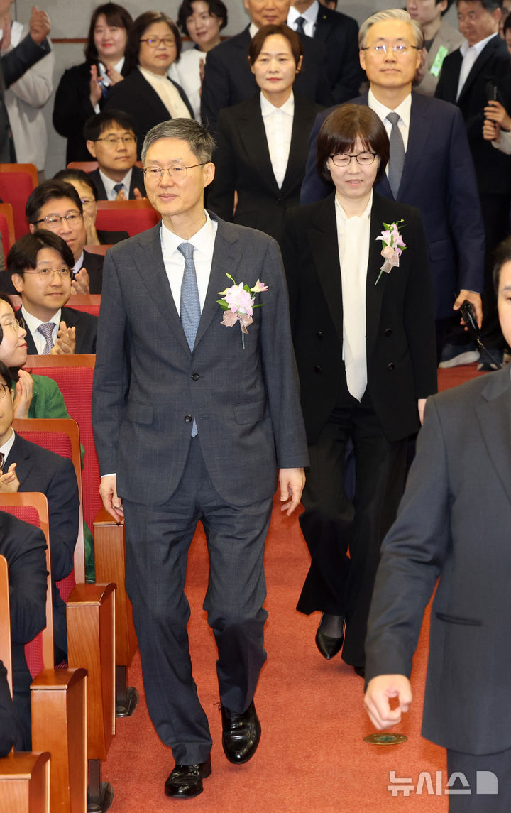 退任のお祝いを受ける文炯培・憲法裁所長権限代行と李美善・憲法裁判官(3/15)