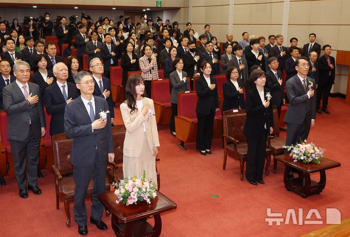 退任のお祝いを受ける文炯培・憲法裁所長権限代行と李美善・憲法裁判官(8/15)