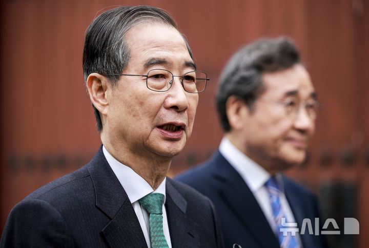 昼食会合を終えた韓悳洙前首相・李洛淵元首相(5/12)