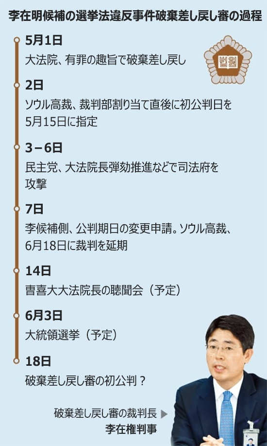 公選法違反で無罪破棄の被告人・李在明に選挙運動の機会を保障、ソウル高裁が差し戻し審初公判を大統領選後に延期(2/2)