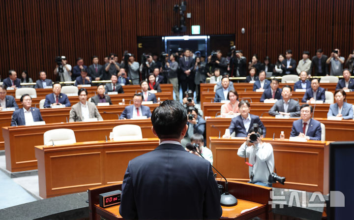 両手の拳を握りしめる与党・国民の力の金文洙大統領選候補 /ソウル(6/9)