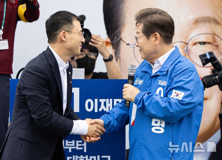 「国民の力を離党」金相旭議員と抱擁する李在明候補(5/9)