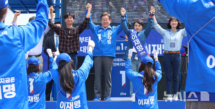俳優パク・ヒョククォンと一緒にあいさつする李在明候補(2/10)