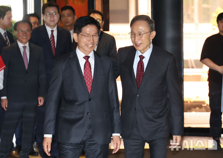 昼食会合を開いた金文洙候補と李明博・元大統領(1/14)