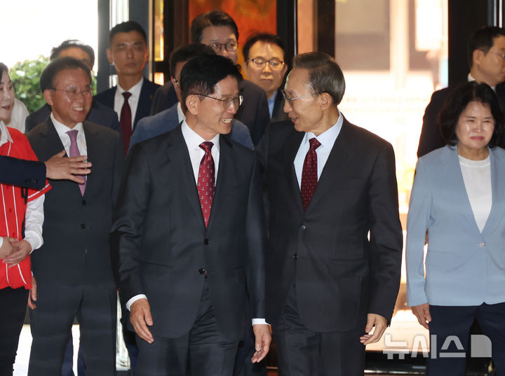 昼食会合を開いた金文洙候補と李明博・元大統領(4/14)