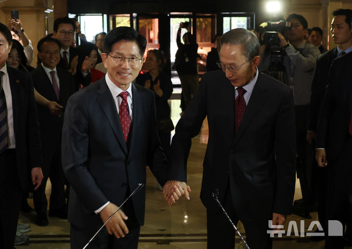 昼食会合を開いた金文洙候補と李明博・元大統領(8/14)