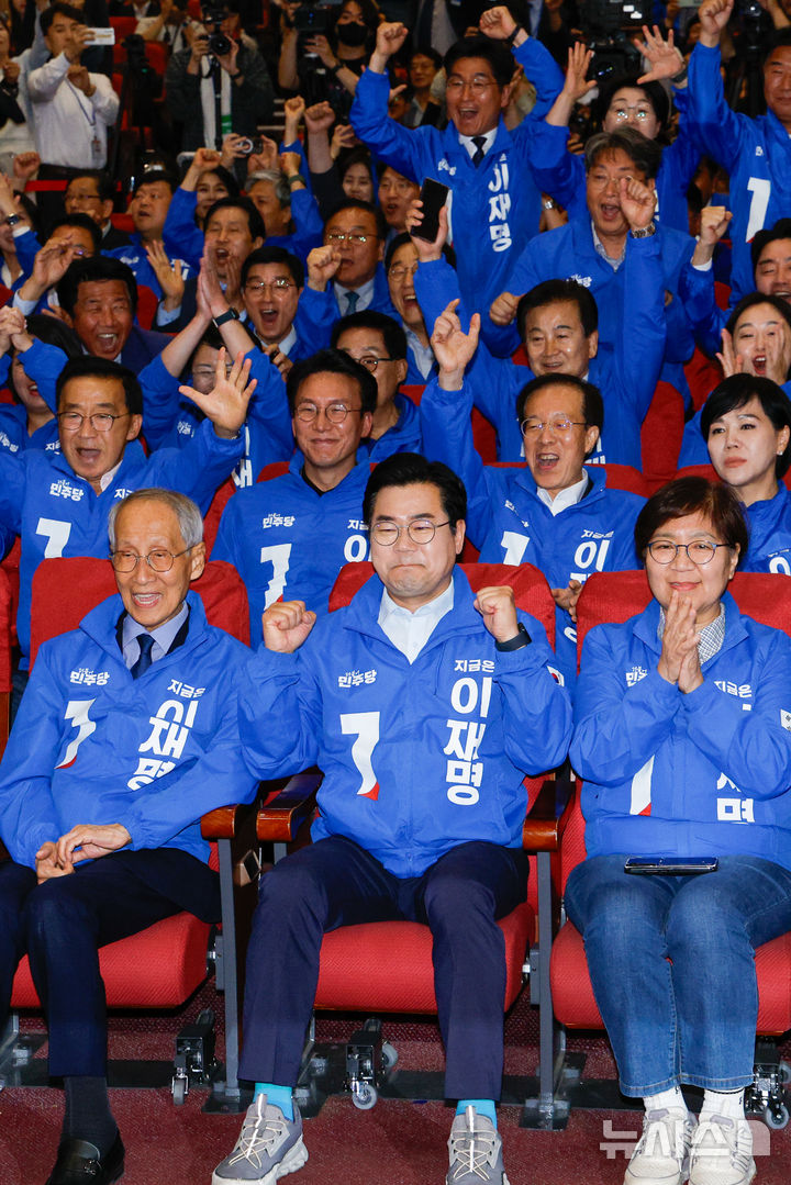 出口調査の結果を確認して喜ぶ民主党(4/10)
