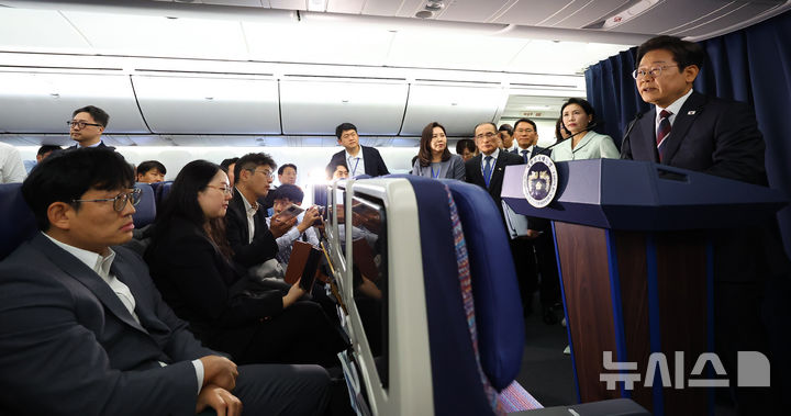 G7サミット出席へ 機内記者懇談会をする李在明大統領(12/15)