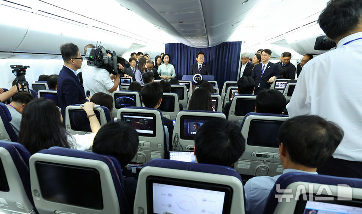 G7サミット出席へ 機内記者懇談会をする李在明大統領(13/15)