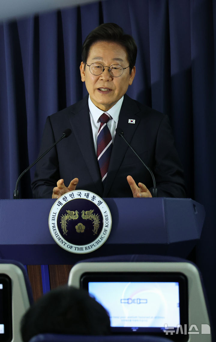 G7サミット出席へ 機内記者懇談会をする李在明大統領(3/15)