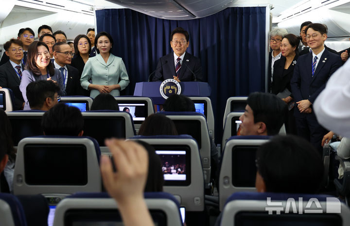 G7サミット出席へ 機内記者懇談会をする李在明大統領(4/15)