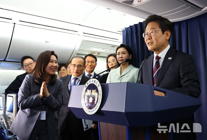 G7サミット出席へ 機内記者懇談会をする李在明大統領(5/15)