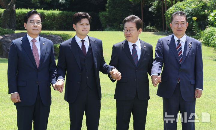 李在明大統領、与野党指導部と手を取り記念撮影(3/10)