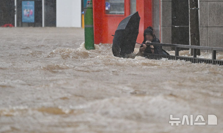 流されないように橋の欄干につかまり、救助を求める人 /光州(3/8)