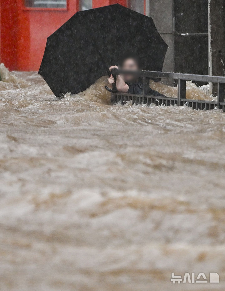 流されないように橋の欄干につかまり、救助を求める人 /光州(5/8)