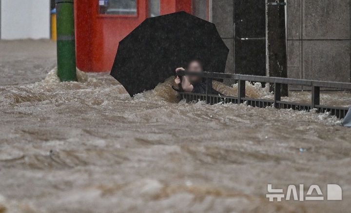 流されないように橋の欄干につかまり、救助を求める人 /光州(6/8)