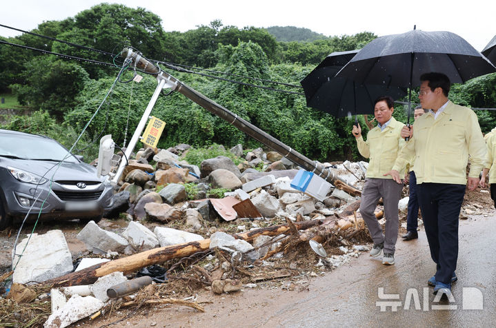 豪雨被害の現場を訪れた李在明大統領=慶尚南道山清(7/12)