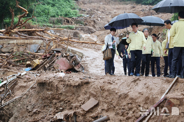豪雨被害の現場を訪れた李在明大統領=慶尚南道山清(9/12)
