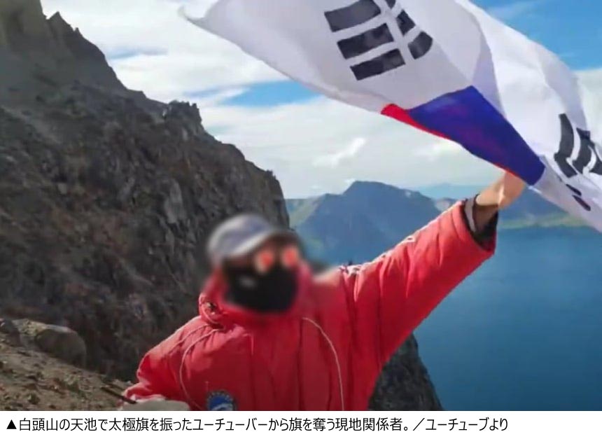 中朝国境の観光地「天池」で太極旗を振った韓国人ユーチューバー、現地関係者に旗を奪われる(2/2)
