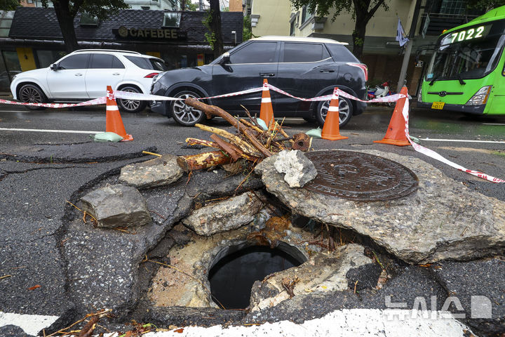 豪雨で破損したアスファルト(2/11)