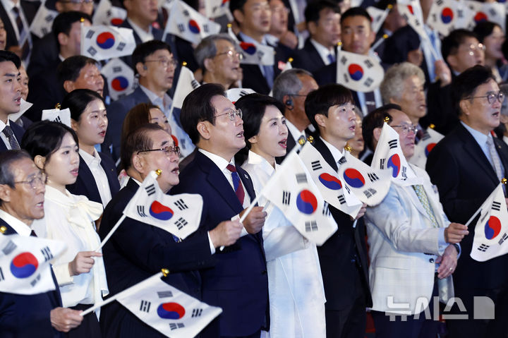 光復節の歌を斉唱しつつ太極旗を振る李在明大統領(2/5)