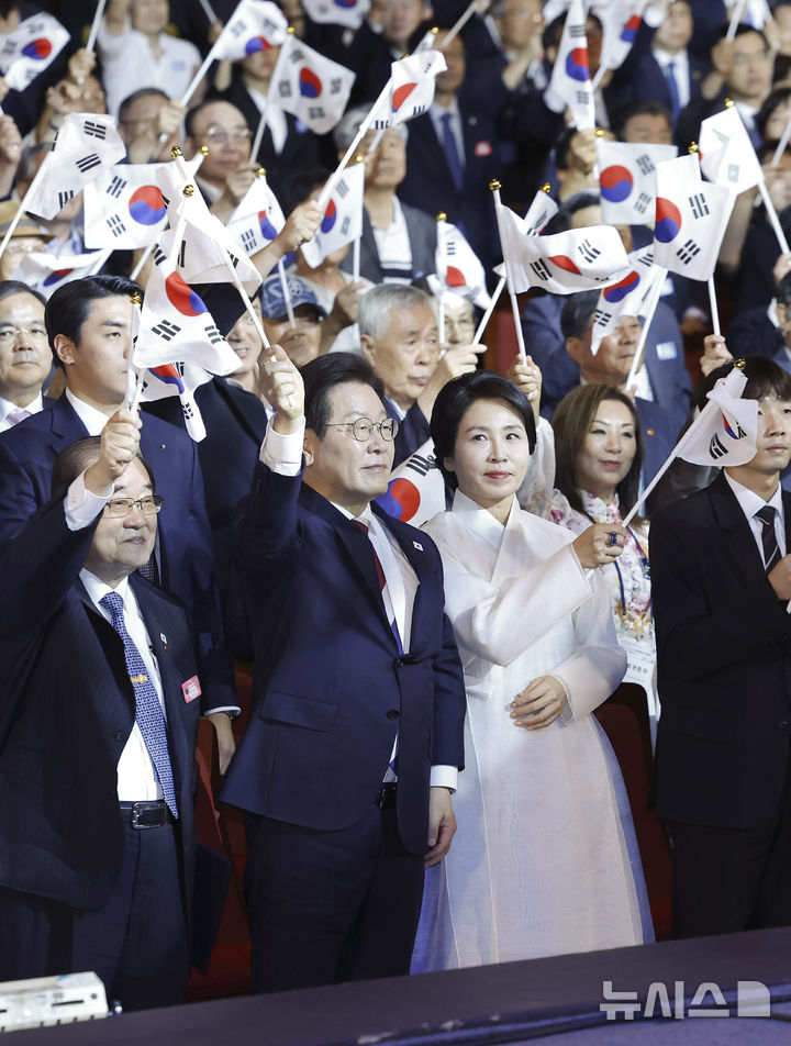 光復節の歌を斉唱しつつ太極旗を振る李在明大統領(3/5)