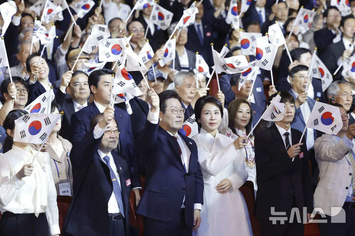 光復節の歌を斉唱しつつ太極旗を振る李在明大統領(4/5)