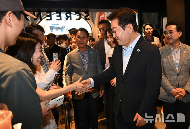 映画鑑賞後、市民に手を振る李在明大統領 /ソウル(4/9)