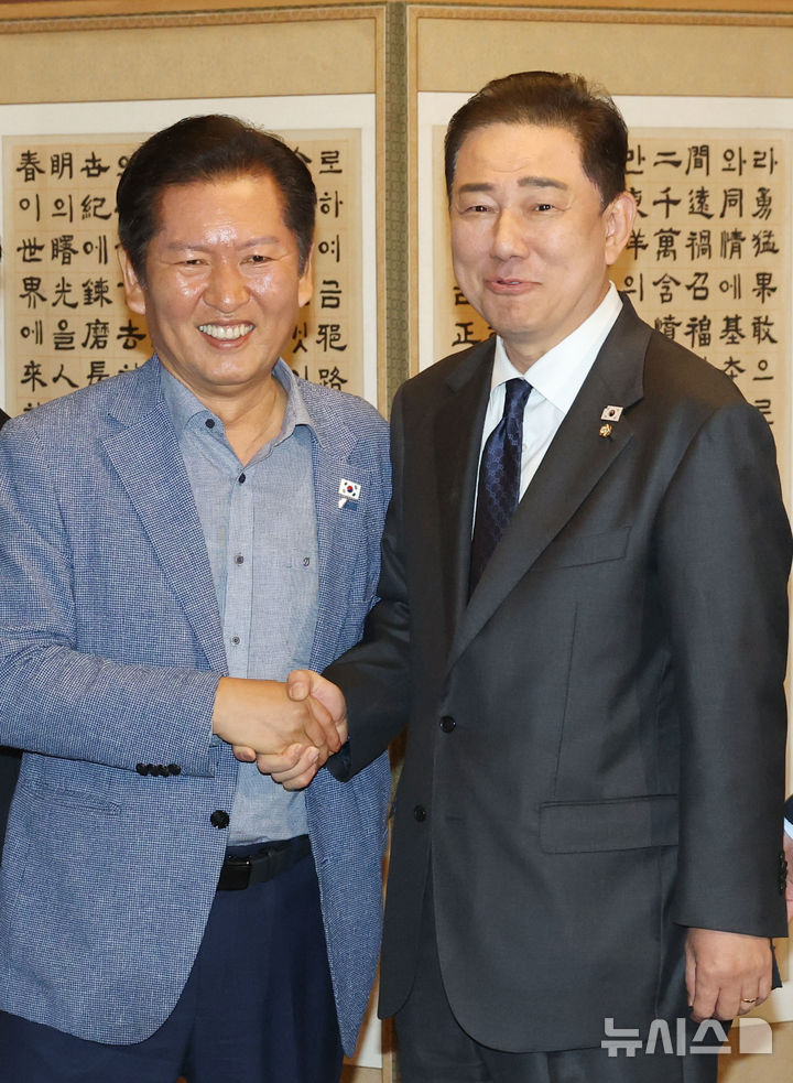 握手する共に民主党・鄭清来代表と金炳基院内代表(9/14)