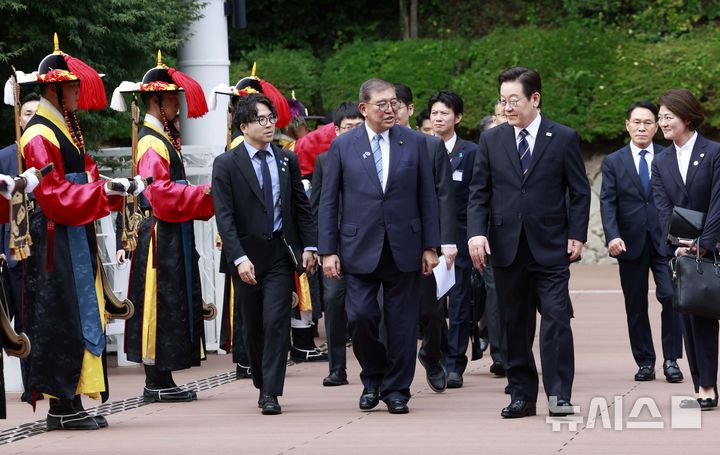韓日首脳会談:記念撮影する李在明大統領と石破茂首相(13/17)