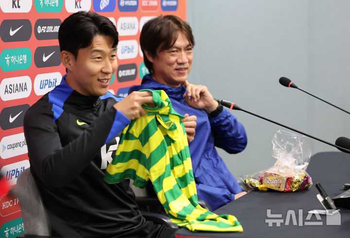 笑顔を見せる洪明甫監督とソン・フンミン選手(3/12)