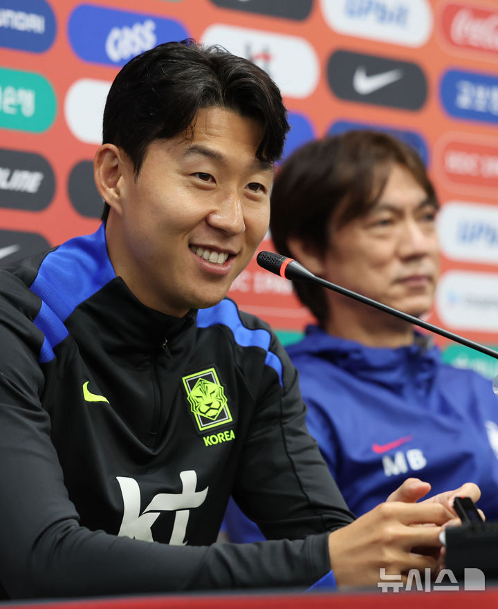 笑顔を見せる洪明甫監督とソン・フンミン選手(8/12)