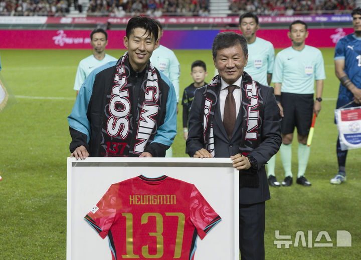 サッカー:韓国Aマッチ最多出場記念ユニホームを贈られたソン・フンミン(4/6)
