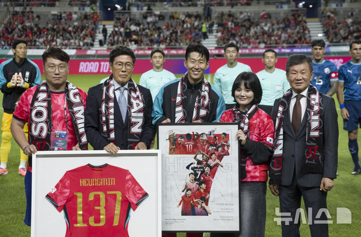 サッカー:韓国Aマッチ最多出場記念ユニホームを贈られたソン・フンミン(5/6)