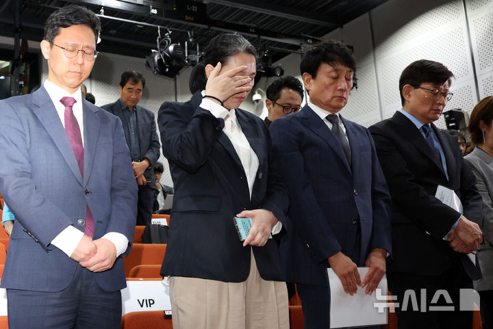故オ・ヨアンナさんの1周忌対国民記者会見に出席する安亨浚社長とチャン・ミョンミさん(2/26)