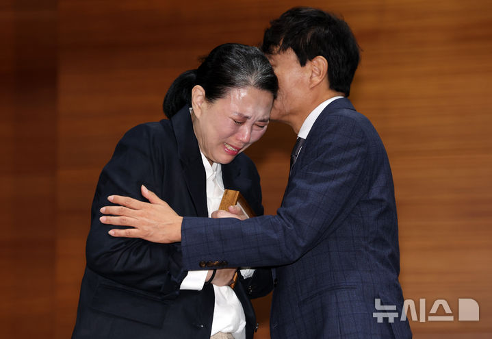 故オ・ヨアンナさんの1周忌対国民記者会見に出席する安亨浚社長とチャン・ミョンミさん(3/26)