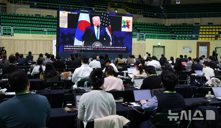 メディアセンターに中継されるトランプ大統領の特別演説(2/12)