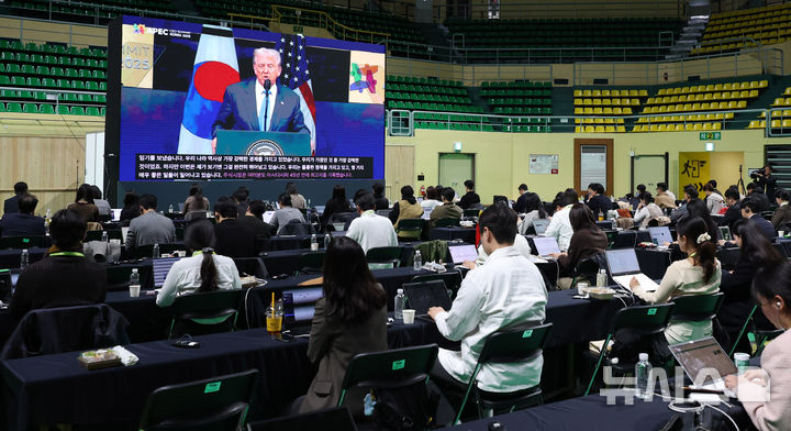 メディアセンターに中継されるトランプ大統領の特別演説(12/12)