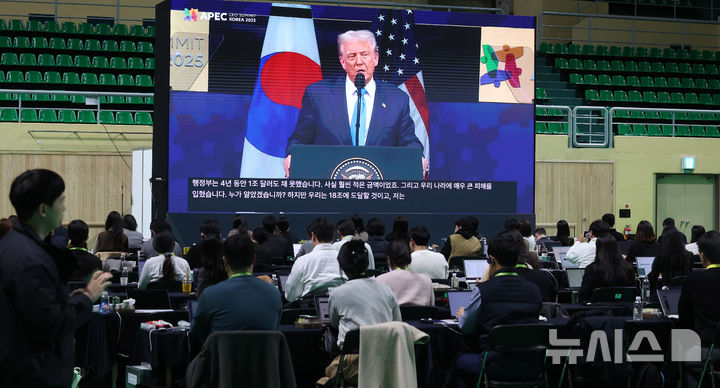 メディアセンターに中継されるトランプ大統領の特別演説(4/12)