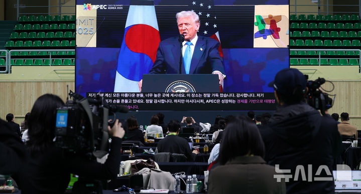 メディアセンターに中継されるトランプ大統領の特別演説(6/12)