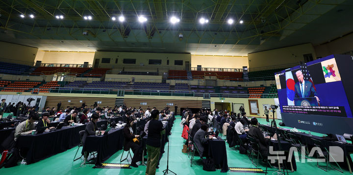 メディアセンターに中継されるトランプ大統領の特別演説(9/12)