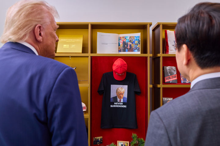 トランプ・グッズ展示の前で記念撮影する韓米首脳 /慶尚北道・慶州(2/12)