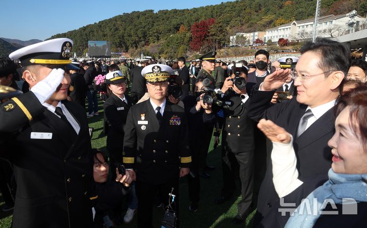 イ・ジホさんの敬礼を受ける李在鎔会長・洪羅喜名誉館長(3/23)