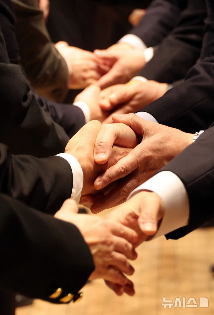政府仕事始めで握手する金民錫首相と閣僚(3/7)