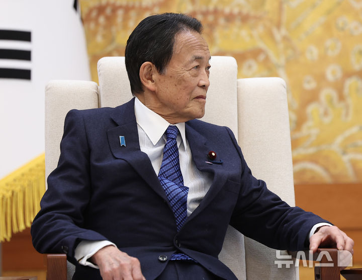 握手をする李在明大統領と麻生太郎・元副総理(12/14)