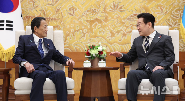 握手をする李在明大統領と麻生太郎・元副総理(6/14)