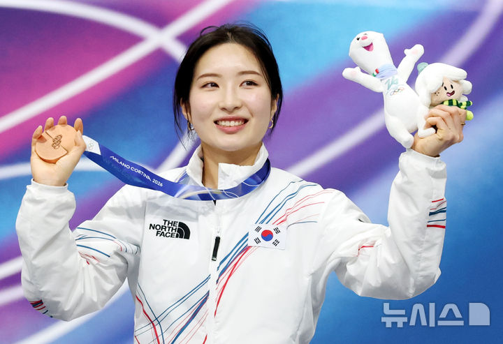 ショートトラック女子1000メートルの銅メダルを首にかけたキム・ギルリ ミラノ冬季五輪(4/11)