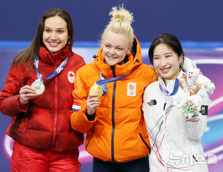 ショートトラック女子1000メートルの銅メダルを首にかけたキム・ギルリ ミラノ冬季五輪(8/11)